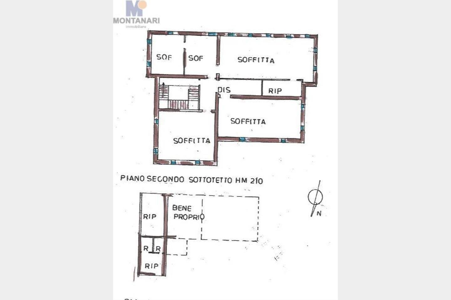 – piano secondo: locali mansardati con salone con camino, cucina, due camere e bagno, il tutto di circa 131 mq. ;